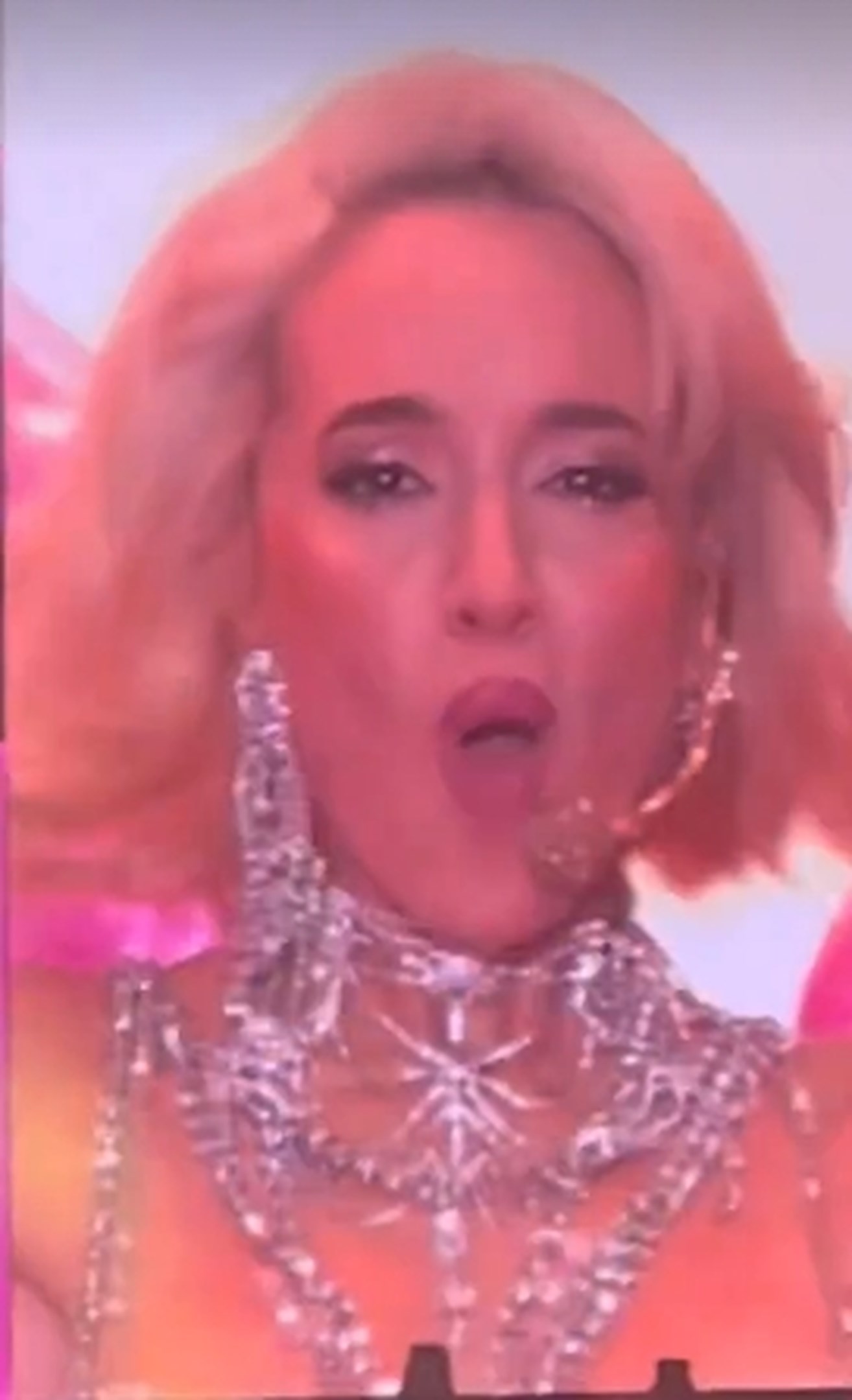 Η Καλομοίρα εμφανίστηκε με λαμπερό κορμάκι και πολλά ροζ φτερά και πούπουλα.